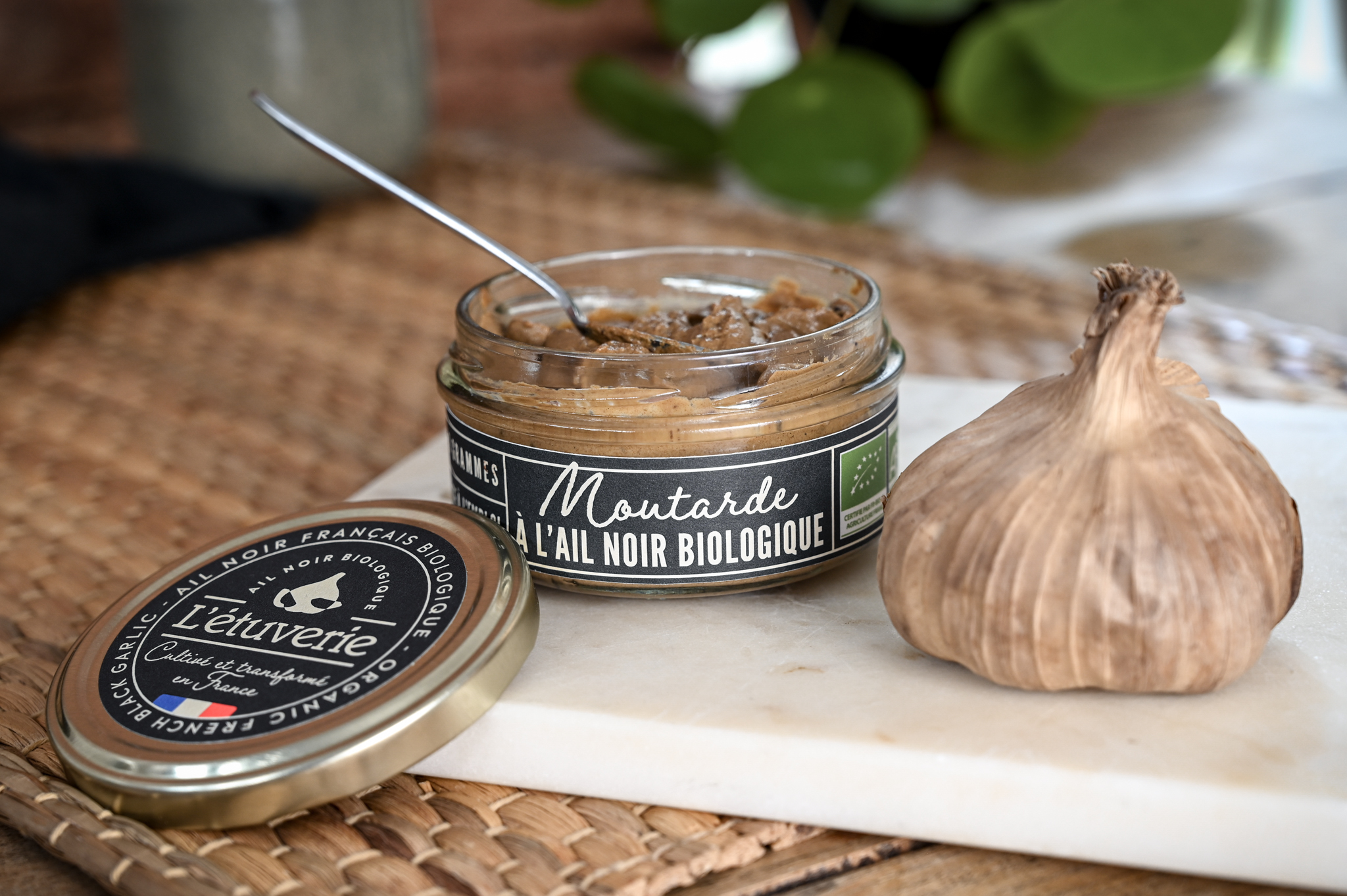 Notre moutarde à l’ail noir bio accompagnera vos viandes, légumes ou vinaigrette.